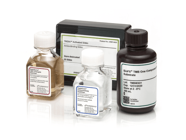 Curing disease starts at diagnosis. It is imperative that diagnostic assays, including ELISA Assays be consistent and reliable to accurately detect disease. Developing accurate and reliable diagnostic assays starts with using the right reagents. Surmodics IVD’s reagents include the industry’s gold standard in protein stabilizers/blocking buffers designed to increase sensitivity and specificity while decreasing non-specific binding. We also offer best-in-class detection substrates for color (Colorimetric Substrates such as TMB, ABTS, PNPS, BCIB/NBT) and light (Chemiluminescent Substrate such as Luminol) development as well as a selection of accessory reagents including our high-performance diluents designed to reduce matrix interferences including Human Anti-Mouse Antibodies (HAMA) and Rheumatoid Factor (RF) interferences.